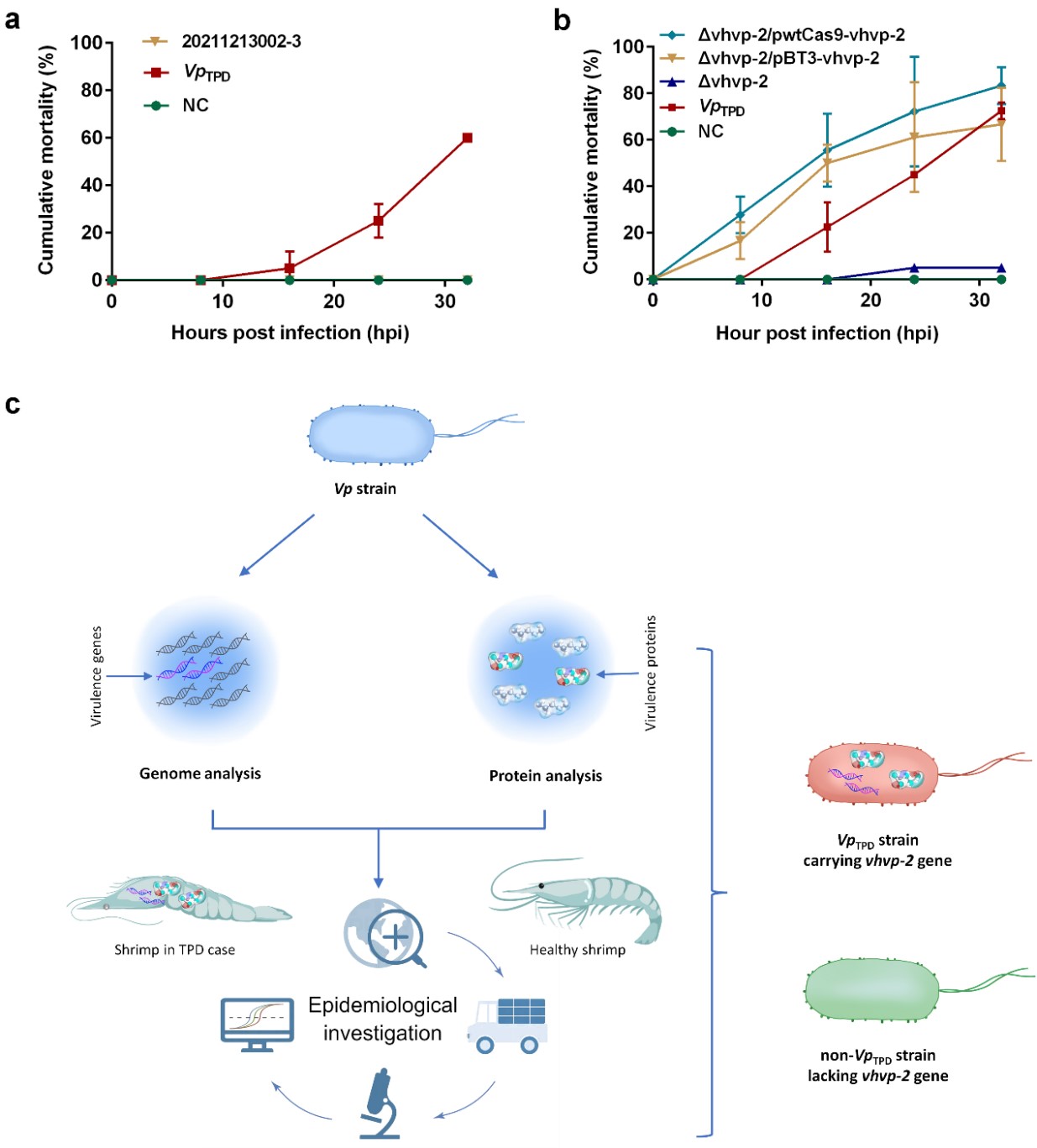 黃海水產研究所海水魚蝦流行病學與病害防控創新團隊通過質譜與比較基因組分析、毒力基因敲除與回補分析等系統研究發現,TPV是由攜帶沙門氏菌毒性質粒毒力基因與殺蟲蛋白毒力基因(雙毒力基因)的弧菌(Vibriospp. causing TPV,VTPV)引起的細菌性疫病。TPV關鍵毒力因子VHVP-2由187 kb毒性質粒上的關鍵毒力基因vhvp-2編碼,后者位于VTPV毒性質粒可移動元件上,具有在不同弧菌菌株間擴散的能力,VTPV因獲得了關鍵毒力基因vhvp-2基因而對對蝦仔蝦具有了強毒力和高致死性。這是自2020年TPV大規模爆發流行以來,首次揭示其致病菌VTPV的高致死性致病機制。本研究是繼該團隊在致玻璃苗弧菌病大規模爆發流行期間首次鑒定到玻璃苗致病菌(Zouet al., 2020)等工作之后,在TPV致病菌致病機制研究方面取得的又一重要成果。以上工作發表于國際主流期刊Microbiology Spectrum。