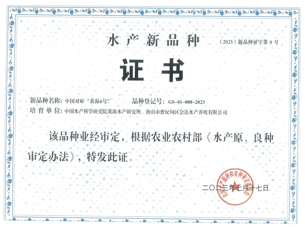 黃海水產研究所凡納濱對蝦和中國對蝦遺傳育種創新團隊針對中國對蝦養殖業的困境,立足于中國對蝦產業提升和綠色發展,聚焦中國對蝦低溫耐受性、WSSV抗性、存活率和收獲體重等主要選育性狀,基于多性狀復合育種技術進行中國對蝦新品種選育,于2023年成功獲批國審新品種“黃海6號”(水產新品種登記號:GS-01-008-2023),實現早放苗、晚收獲(錯峰),延長養殖時間,達到增產增收效果。