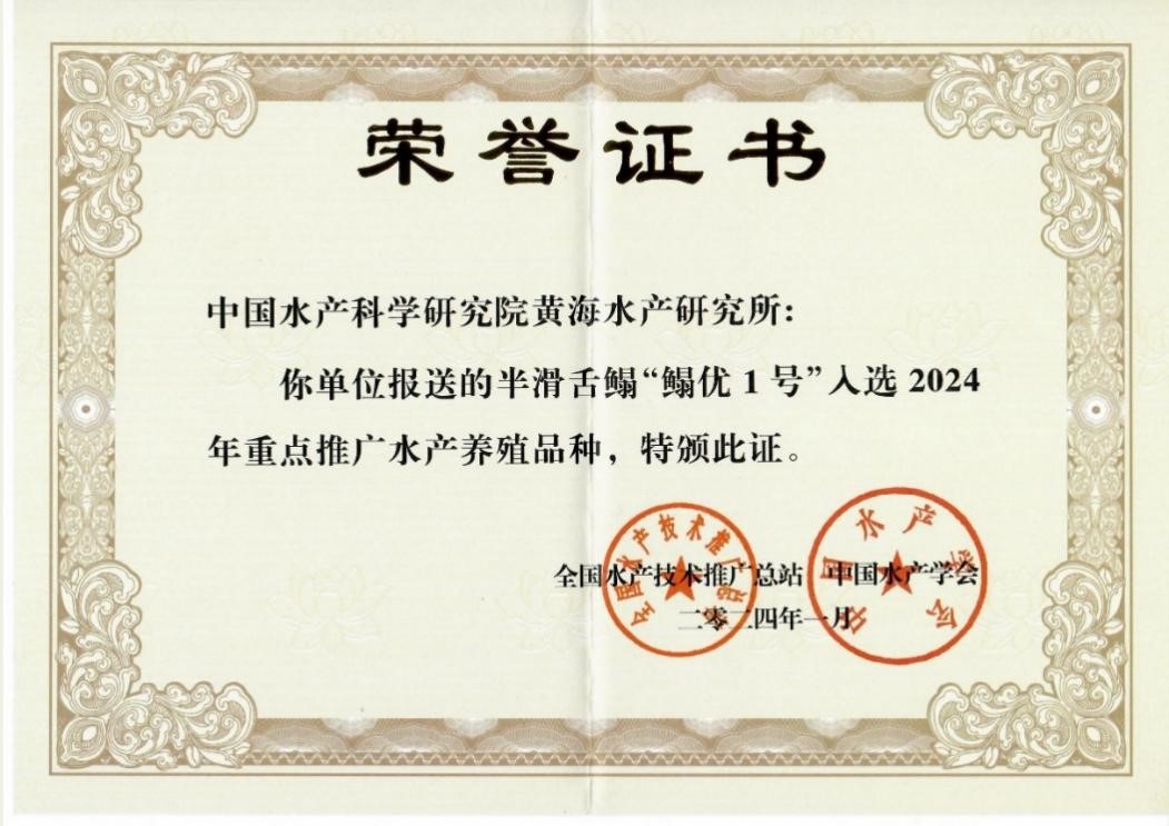 日前,全國水產技術推廣總站、中國水產學會發布了《2024年重點推廣水產養殖品種和重點推廣水產養殖技術的通知》,共遴選出國內29個重點推廣水產養殖品種和15項重點推廣水產養殖技術。中國水產科學研究院黃海水產研究所培育的半滑舌鰨 “鰨優 1 號”、石斑魚“金虎雜交斑”、中國對蝦“黃海6號”等3個水產新品種以及“工廠化循環水養殖技術”“多營養層級綜合養殖技術”等2項水產養殖技術榜上有名。