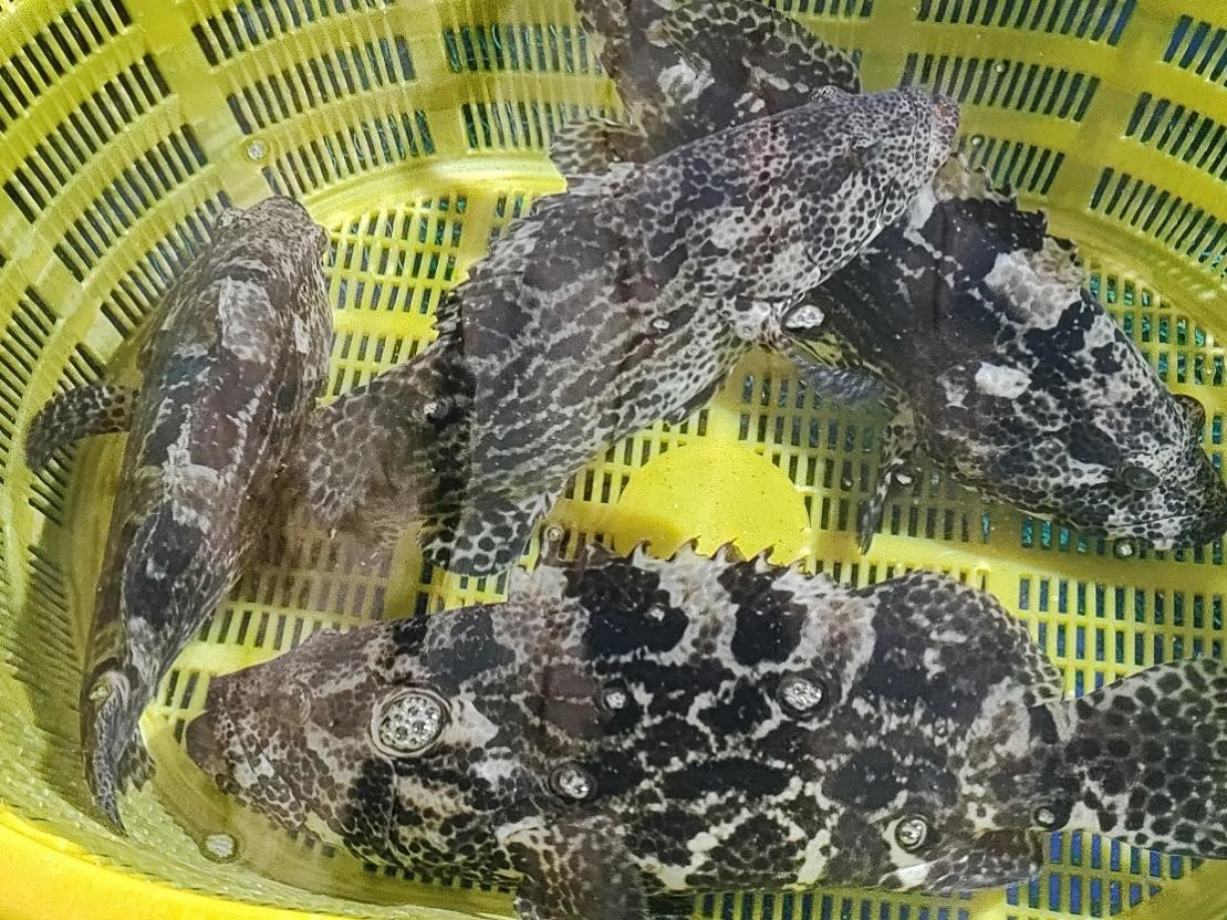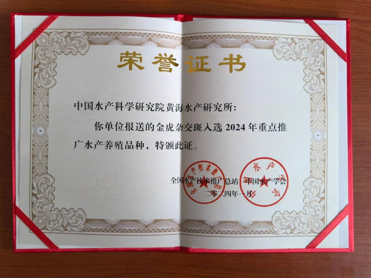 黃海水產研究所田永勝研究員團隊與萊州明波水產有限公司、海南晨海水產有限公司和中山大學等單位聯合培育的石斑魚新品種“金虎雜交斑”,具有生長快、耐溫廣、耐低氧、耐低鹽和營養豐富等優良性狀。1-2齡金虎雜交斑體重較母本(棕點石斑魚)提高74.4%-100.2%,較同類養殖種珍珠龍膽提高48.8%-60.7%;停食溫度16℃,較母本降低3℃;耐低氧可達0.24mg/L,鹽度適應范圍8-35‰,肌肉中粗蛋白(20.2%)、必需氨基酸(7.7%)和總氨基酸(18.53%)含量均高于母本和普遍養殖種。“金虎雜交斑”可以在我國海水工廠化、池塘、網箱及西部半堿水環境中普遍養殖,其培育成功和廣泛推廣,為我國漁業現代化養殖提供了高效、優質的石斑魚品種,將有力推動漁業種業創新和產業發展。