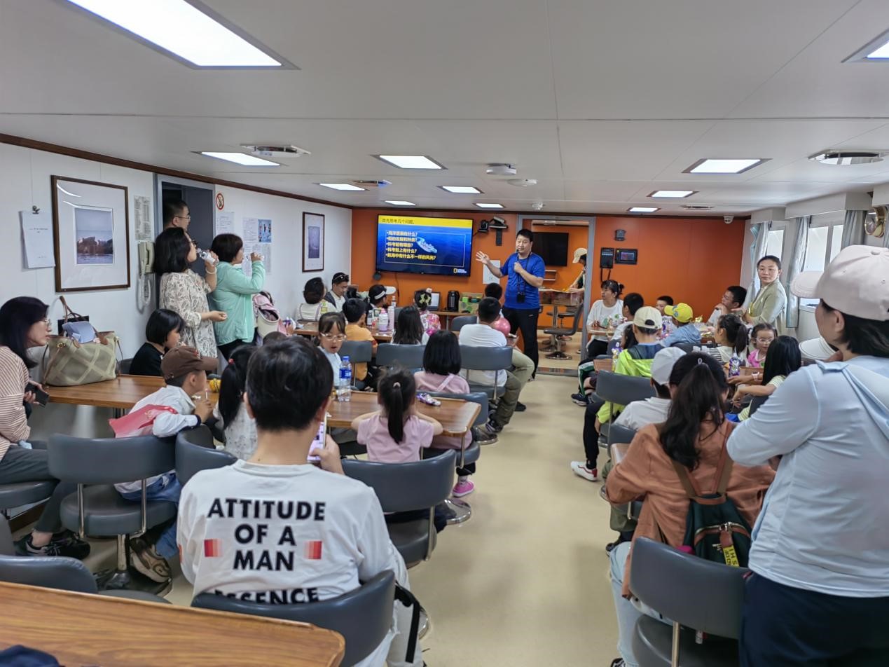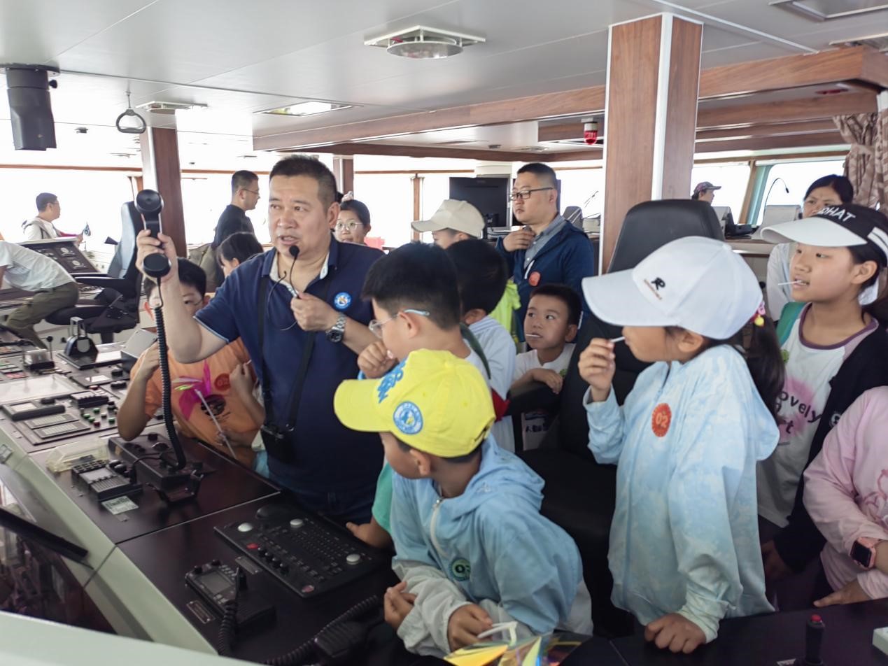 在“藍海101”號科考船上,船長禹昊帶領大家參觀了駕駛室、船艙、甲板等主要工作區域,同時現場講解和示范了船舶操縱的基本方法以及海上日常工作的基本內容,并為小朋友們精心準備了禮物。船舶處袁兵兵作了內容豐富、形象生動的海洋科普知識講座,對各類船舶的結構、特點和功能進行了深入淺出地講解。