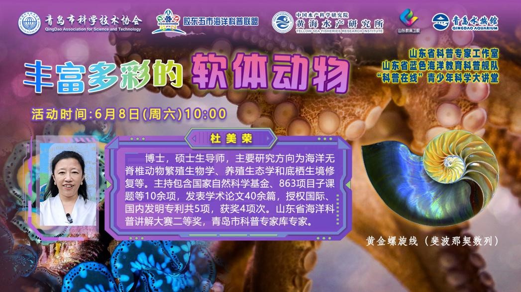 6月8日是世界海洋日,中國水產科學研究院黃海水產研究所海水養殖生態與技術研究室副研究員、碩士研究生導師杜美榮博士受青島海洋科普聯盟、山東省藍色海洋教育科普艦隊邀請,作“豐富多彩的軟體動物”專題直播報告。