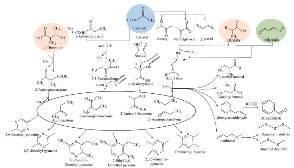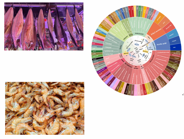典型干制水產(chǎn)品風味輪廓(右上)與關鍵風味物質代謝途徑