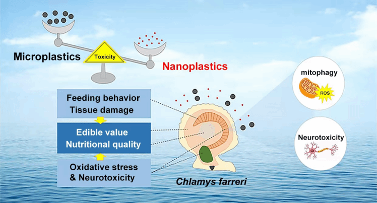 黃海所黃渤海漁業(yè)生態(tài)環(huán)境評價與生物修復創(chuàng)新團隊針對微納塑料及吸附態(tài)污染物對海洋水產(chǎn)品質量安全的潛在威脅開展了系統(tǒng)性研究,揭示了典型養(yǎng)殖區(qū)生物體內微塑料與多環(huán)芳烴(PAHs)的復合污染特征及其相互作用。研究發(fā)現(xiàn),生物體內微塑料豐度與PAHs總含量呈現(xiàn)顯著正相關,證實了微塑料作為載體顯著促進了PAHs的生物富集效應。進一步分析表明,纖維狀、透明和彩色微塑料與PAHs含量的相關性更為顯著,這為闡明微塑料表面特性對其載體效應的影響機制提供了重要實驗依據(jù)。研究還發(fā)現(xiàn)環(huán)境濃度微納塑料暴露會顯著降低櫛孔扇貝的肥滿度和閉殼肌蛋白質含量,其中納塑料的影響更為顯著,其毒性機制主要涉及線粒體自噬通路異常激活、氧化應激響應增強以及神經(jīng)相關基因表達的改變。研究結果為深入理解微納塑料的海洋水產(chǎn)品質量安全風險提供了新的科學視角,對防控和治理海洋新污染物具有重要意義。研究成果發(fā)表在Journal of Hazardous Materials和Science of the Total Environment。