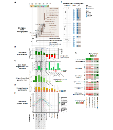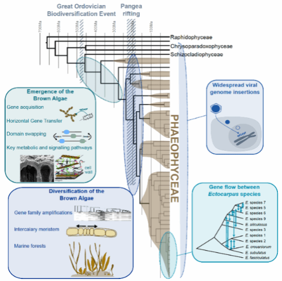研究團隊構建了涵蓋褐藻門主要類群的基因組數(shù)據(jù)庫,有效填補了多種褐藻基因組數(shù)據(jù)空白。通過對基因組數(shù)據(jù)的深入解析,研究團隊發(fā)現(xiàn)新直系同源基因家族的獲得、蛋白質結構域重排、水平基因轉移事件,以及一系列與生存和適應密切相關的代謝途徑的演化共同驅動了褐藻譜系的發(fā)生與分化,揭示了褐藻中海藻酸、鹵素和多酚等代謝途徑對褐藻適應性特征的塑造作用,闡釋了褐藻基因組多樣性與生活周期策略和配子鞭毛結構等諸多表型特征多樣性分化之間的緊密聯(lián)系。黃海所團隊負責其中的水平基因轉移事件分析工作。