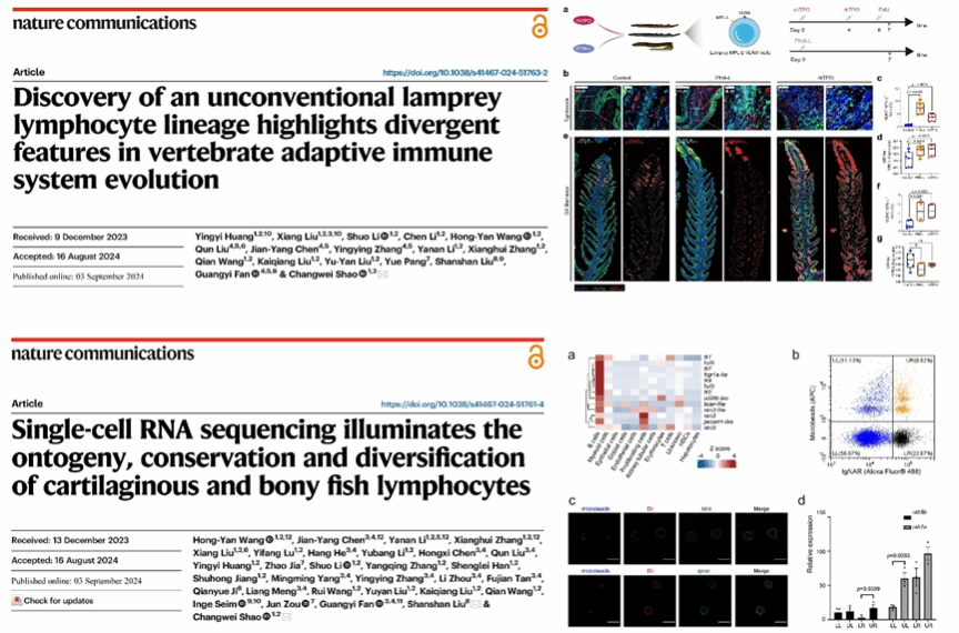 適應性免疫系統(tǒng)是脊椎動物獨有的免疫防御屏障。黃海所海洋漁業(yè)生物遺傳資源評價與合成利用創(chuàng)新團隊在脊椎動物適應性免疫系統(tǒng)的演化研究中取得重要突破,研究成果以兩篇研究論文形式在國際著名期刊《自然·通訊》(Nature Communications)背靠背發(fā)表。