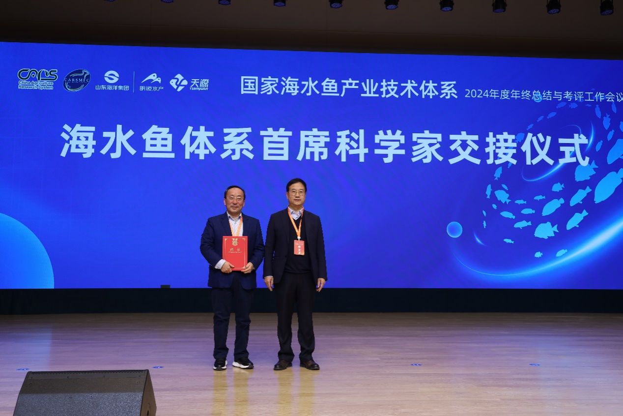 農業農村部漁業漁政管理局高度重視海水魚體系建設,王欣太副局長親自到會指導,肯定了海水魚體系2024年的工作成績;科技與市場加工處處長曾昊主持了對首席科學家的考評及新老首席交接工作。首席科學家關長濤研究員作海水魚體系2024年度述職匯報,接受了海水魚體系全體人員的評議及民主測評。會議宣布,自2025年起,海水魚體系首席科學家將由中國工程院院士、黃海所陳松林研究員擔任。王英凡宣讀了《農業農村部關于印發現代農業產業技術體系增補聘用人員名單的通知》,在全體與會人員的見證下,海水魚體系新老首席科學家完成交接。陳松林院士代表新一屆海水魚體系集體表態發言,肯定了關長濤首席為海水魚體系建設和產業發展所作的突出貢獻,提出了未來海水魚體系的工作重點。