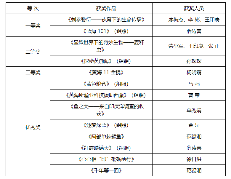 中國水產科學研究院黃海水產研究所認真對待、精心安排,組織全所干部職工積極響應、踴躍投稿,推薦的作品中有13幅作品分獲一、二、三等獎和優秀獎,黃海所獲優秀組織獎。