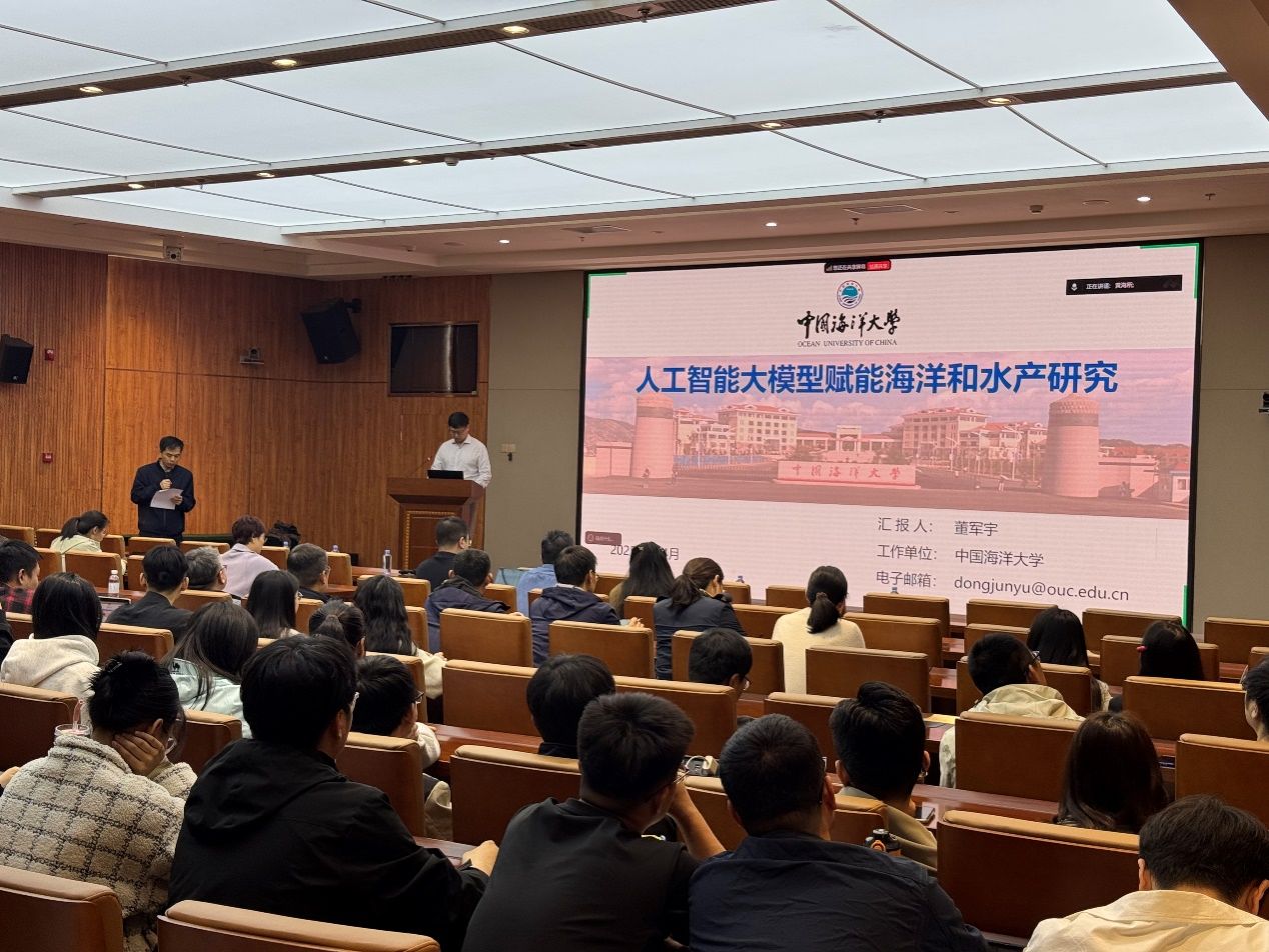 董軍宇教授作了題為“人工智能大模型賦能海洋與水產研究”的學術報告,系統介紹了海洋領域的大模型及其研究進展,重點分享了人工智能在海洋環境預報、水產養殖等領域的應用情況,并展望了人工智能的發展趨勢與前景。報告引起了與會人員的熱烈反響。