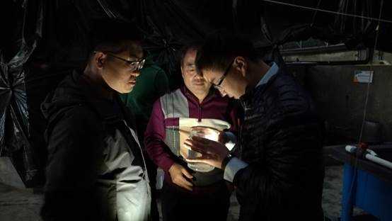 代表團成員參觀海研養殖公司車間并觀察其苗種繁育情況
