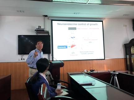 報告會上,段存明教授作了題為“魚類生長調控分子機理的新進展”的學術報告,介紹了其研究團隊在斑馬魚胰島素樣生長因子結合蛋白(IGFBP)方面的最新研究進展,發現IGFBP1和IGFBP5a在內分泌和鈣離子調節方面的新功能,這為系統解析IGFBP在魚類生長發育過程中的作用提供了新視角和新思路。報告引起了參會人員的廣泛興趣,并與段存明教授就相關問題展開了深入探討與交流。會后,段存明教授實地參觀了水產生物技術與基因組研究室,與團隊成員圍繞魚類基因敲除技術、鲆鰈魚類生長等具體問題進行了溝通與交流。