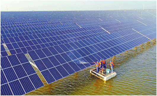 濱州市沾化區通匯30萬千瓦“漁光一體”項目占地9000余畝,充分利用立體空間,融合光能、海水等要素,配合風機和鹽田,形成了“上光中風下漁底鹽”的發展模式,實現藍色產業綠色轉型。目前,該項目總裝機量300兆瓦,年可發電4.2億度,年產“鹽田蝦”200噸、產值約1400萬元。