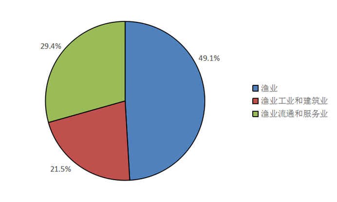 按當年價格計算,全社會漁業經濟總產值27543.47億元,其中漁業產值13517.24億元,漁業工業和建筑業產值5935.08億元,漁業流通和服務業產值8091.15億元,三個產業產值的比例為49.1:21.5:29.4,如圖1所示。漁業流通和服務業產值中,休閑漁業產值825.72億元,同比下降14.32%。