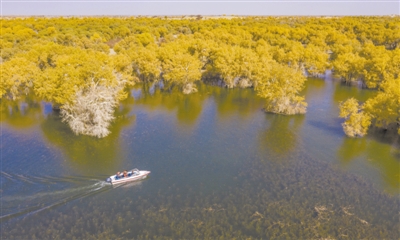下圖 10月27日,濕地公園管理中心的工作人員駕駛快艇巡查胡楊生長狀況(無人機照片)。
