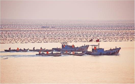 2月4日,榮成市一家海洋牧場(chǎng),漁民駕駛養(yǎng)殖船出海作業(yè)。