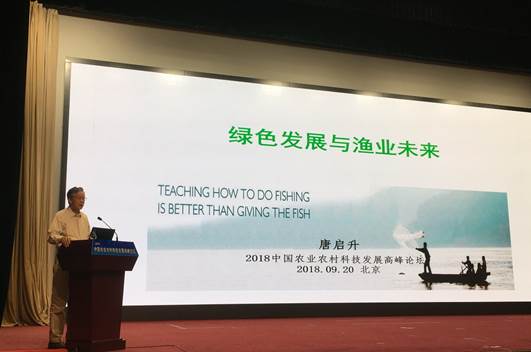 論壇設置了高端學術交流版塊,黃海水產研究所唐啟升院士受邀參會,就“綠色發展與漁業的未來”主題做大會學術報告。他的報告強調,中國特色的水產養殖既具有重要的食物供給功能,又有顯著的生態服務功能(含文化服務),提出綠色低碳的“碳匯漁業”發展新理念和漁業“高效、優質、生態、健康、安全” 的可持續發展目標,提出了建設環境友好型水產養殖業和建設資源養護型捕撈業的發展新模式,明確了綠色發展是中國漁業的現在和未來,綠色發展使漁業五大產業和三產融合發展更具活力,也使漁業在實施鄉村振興戰略和精準扶貧中發揮更加重要的作用,漁業綠色發展將在新時代為“創造人民美好生活、健康中國建設、生態文明建設和農業現代化強國建設”作出新的更大的貢獻。