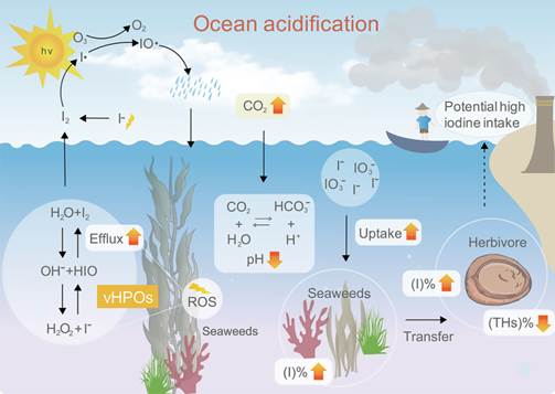 圖3. 酸化條件下近岸海洋生態系統碘生物地化循環示意圖
