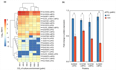 圖2. 海水酸化對海帶鹵代過氧化物酶(vHPOs)基因和蛋白表達水平的影響