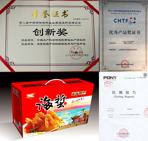 針對海蜇制品中鋁殘留量嚴重超標的問題,黃海水產研究所水產動物精深加工與綜合利用團隊建立了一套完整的海蜇制品中鋁的控制技術和加工工藝。該技術具有綠色安全、處理成本低、操作簡便、產品品質高等特點。采用該技術加工的即食海蜇,經第三方權威機構檢測,產品中鋁含量均在75 mg/kg以下,大幅低于GB 2760-2014中500 mg/kg的限量值,極大提高了海蜇產品的質量安全。該技術不僅可以有效控制海蜇產品中的鋁含量,同時解決了脫鋁過程會嚴重破壞產品品質的問題,采用該技術加工的即食海蜇口感脆嫩、有韌性,口感好。與同類技術相比,該技術具有明顯的先進性與創新性。該項技術得到了業界的廣泛認可,2項相關專利已經在企業進行了專利獨家許可使用和專利權轉讓,并成功在企業中得到應用,起到了很好的示范推廣作用。2018年獲第二屆中國國際現代漁業暨漁業科技博覽會“創新獎”。