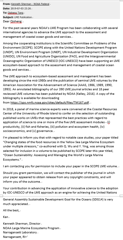 附件:大海洋生態系之父、86歲高齡的Kenneth Sherman博士致唐啟升院士的郵件,概要介紹了大海洋生態系發展歷程、目標、關注點、成果及其相關網址,供學習參考。