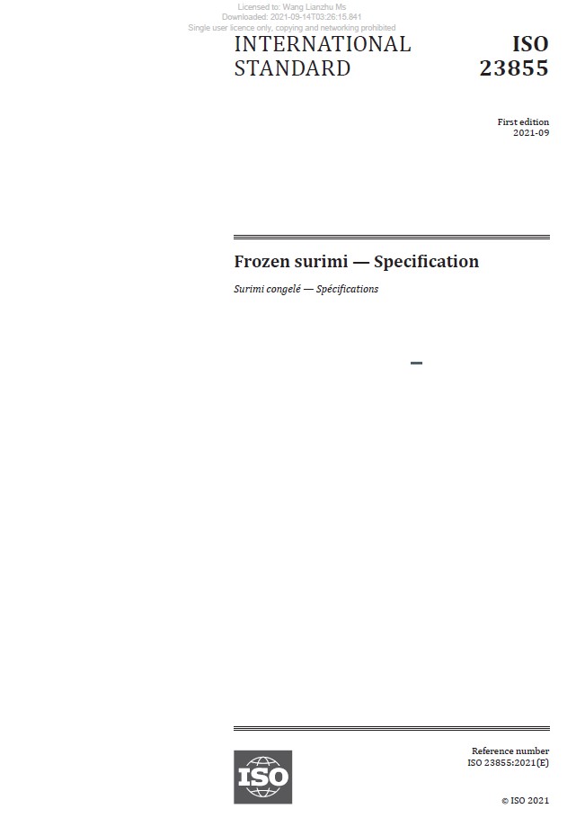 9月8日,國(guó)際標(biāo)準(zhǔn)ISO 23855:2021《冷凍魚(yú)糜》(Frozen surimi — Specification)由ISO正式發(fā)布,這是我國(guó)主持完成的第一項(xiàng)水產(chǎn)領(lǐng)域的國(guó)際標(biāo)準(zhǔn),由中國(guó)水產(chǎn)科學(xué)研究院黃海水產(chǎn)研究所/全國(guó)水產(chǎn)標(biāo)準(zhǔn)化技術(shù)委員會(huì)水產(chǎn)品加工分技術(shù)委員會(huì)主持完成。