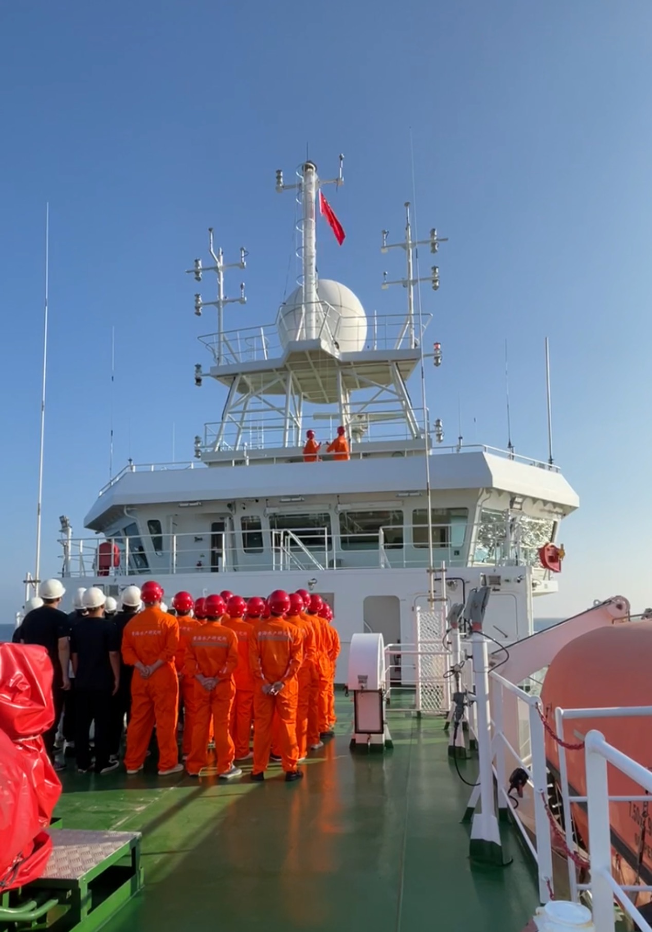 10月1日上午7時,為慶祝中華人民共和國成立72周年,正在黃海海域執行調查任務的中國水產科學研究院黃海水產研究所3000噸級海洋漁業綜合科學調查船“藍海101”號(以下簡稱“‘藍海101’號”)全體成員在航次首席科學家滕廣亮博士的帶領下舉行了升旗儀式,嘹亮的國歌聲響徹了黃海上空,共同祝福偉大祖國母親生日快樂!繁榮昌盛!“藍海101”號科考隊員及船員們在“十一”假期期間堅守崗位,出航執行海洋漁業科考計劃,展現了黃海水產研究所青年科考工作者勇于擔當、甘于奉獻的最美風采。