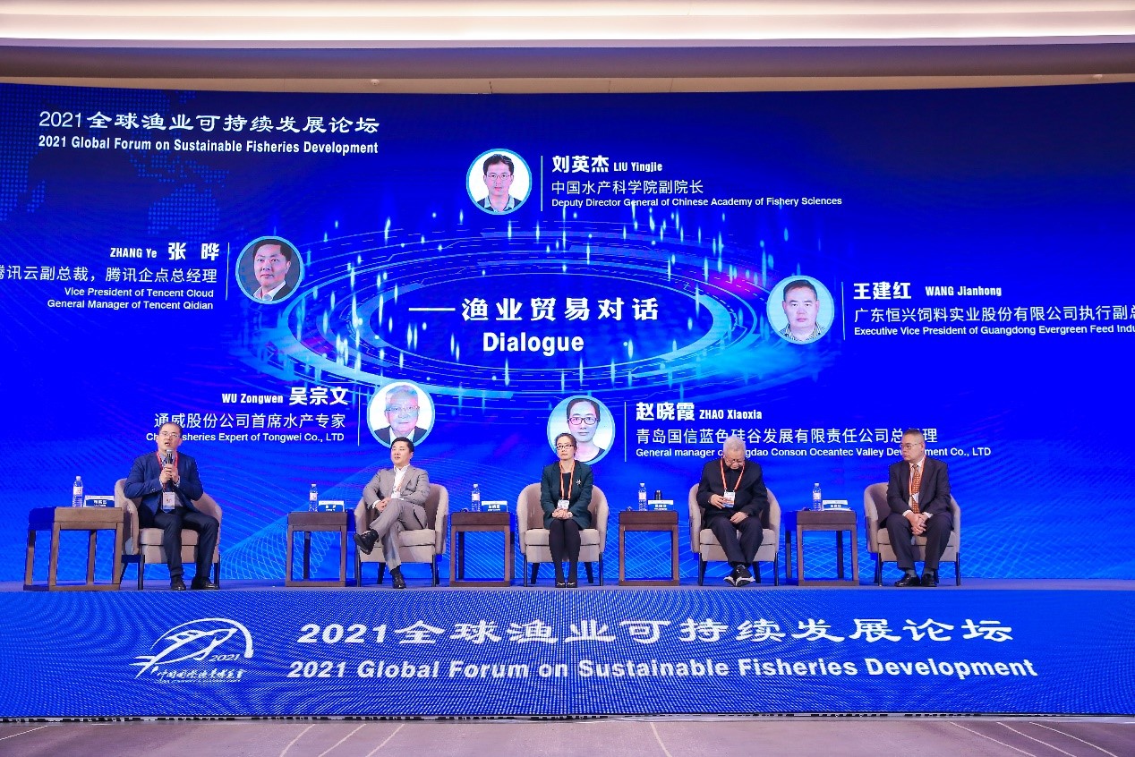 水產貿易對話環節由中國水產科學研究院副院長劉英杰主持,騰訊云副總裁、騰訊企點總經理張曄,青島國信藍色硅谷發展有限責任公司總經理趙曉霞,廣東恒興集團有限公司副總裁王建紅,通威股份公司首席水產專家吳宗文等企業家圓桌對話,就新形勢下全球水產品貿易形式特點、存在的問題與產業展望進行經驗分享,從數字化助力產業轉型升級、突破性工船養殖引領生產、智能“漁光一體”園區模式創新、承建產業園區拓展海外市場等研、產、銷多方面為水產業實現多功能、多效應的現代化轉型升級貢獻思路和方案。