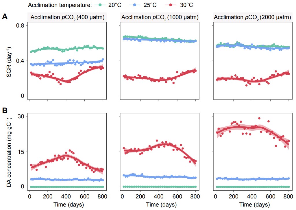 圖2. 海洋升溫和酸化對(duì)多列擬菱形藻生長和軟骨藻酸代謝的影響