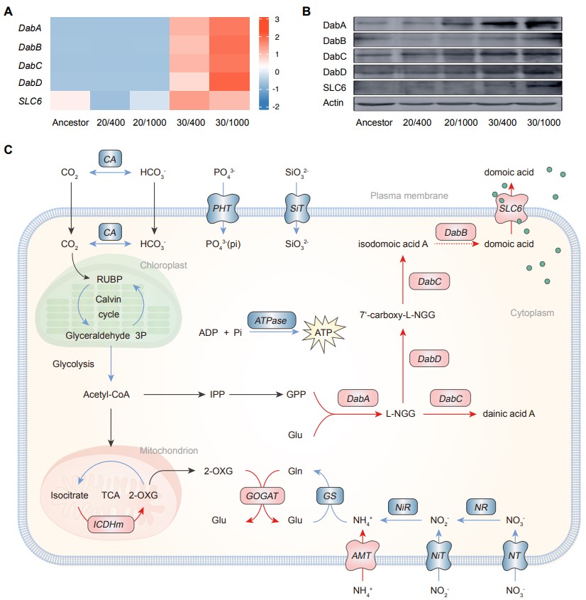 圖3. 長期升溫和酸化下多列擬菱形藻軟骨藻酸代謝調(diào)控機(jī)制