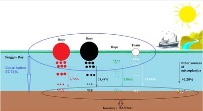 (2) Average abundance of microplastics in the surface sediments of Sanggou Bay was 1674 ± 526 items/kg dry weight, which represented a heavy level when compared with other sea areas, including coastal waters, estuaries, the open sea and other mariculture areas. Microplastics with a size of <0.5 mm were dominant throughout four seasons. The dominant shape of microplastics was granule in summer, autumn and winter, and film in spring, respectively. The most common color of microplastics was transparent. Polyethylene was the dominant polymer in summer, autumn, and winter, while polystyrene accounted for the largest proportion in spring. Approximately 57.72% of the microplastics in surface sediments originated from the plastic mariculture facilities, suggesting that mariculture makes a signi?cant contribution to microplastic pollution in Sanggou Bay. Estimated inventory of microplastics in surface sediments of Sanggou Bay was 183.73 tons. Our results improve the understanding of risks caused by mariculture-derived microplastics to marine ecosystem and human health. (Sui et al., 2020, Science of the Total Environment)