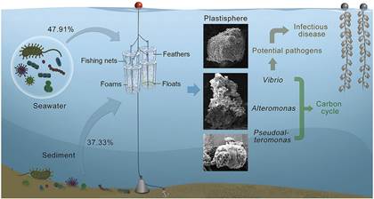 (3) Bacterial communities on microplastics mainly originated from their surrounding seawater and sediment, with an average contribution on total microplastics adherent population of 47.91% and 37.33%, respectively. Principle coordinate analysis showed that community similarity between microplastics and surrounding seawater decreased with exposure time. In addition, lower average bacterial community diversity and higher relative abundances of bacteria from the genera Vibrio, Pseudoalteromonas and Alteromonas on microplastics than those in their surrounding seawater and sediments indicated that microplastics might enrich potential pathogens and bacteria related with carbohydrate metabolism. They are responsible for the signi?cant differences in KEGG Orthology pathways (infectious disease and carbohydrate metabolism) between microplastics and seawater. The KO pathway (Infectious Diseases) associated with MPs was also signi?cantly higher than those with feathers in the nearshore area. Microplastics might be vectors for enrichment of potentially pathogenic Vibrio, and enhance the ecological risk of microplastics to mariculture industry. (Sun et al., 2020, Environmental Pollution)