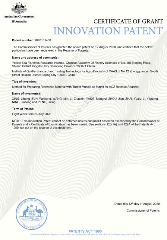 日前,由中國水產科學研究院黃海水產研究所邢麗紅等發明的“一種以大菱鲆肌肉為基質的AOZ殘留標準物質的制備方法”獲澳大利亞革新專利授權,授權專利號:2020101468。
