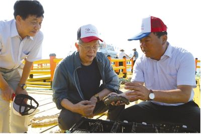 唐啟升(中)考察山東省榮成市東楮島海洋牧場(chǎng)與休閑漁業(yè)。