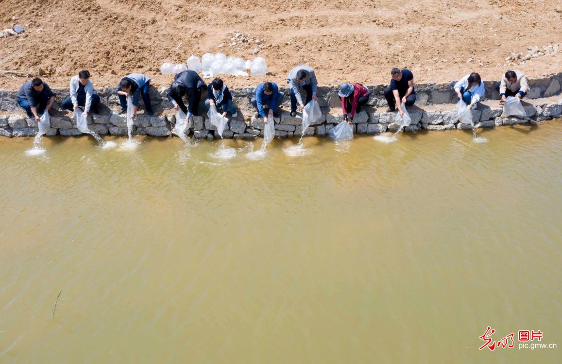 2021年5月5日,中國水產科學研究院黃海水產研究所的科研人員,在山東青島西海岸新區知山樂禾新田園公社,把2000尾嶗山仙胎魚(學名香魚)魚苗投放到園區的水系之中。嶗山仙胎魚是一種珍稀淡水魚,有"嶗山中華鱘"之美譽。(韓加君攝/光明圖片)