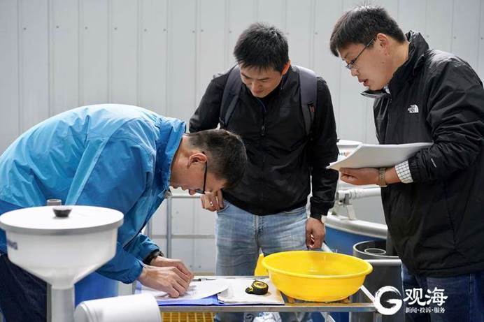 黃海所科研人員對魚苗進行測長。