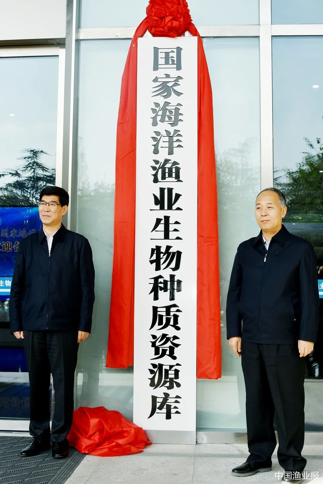 ▲農業農村部副部長馬有祥(右)和山東省副省長李猛(左)為國家海洋漁業生物種質資源庫揭牌