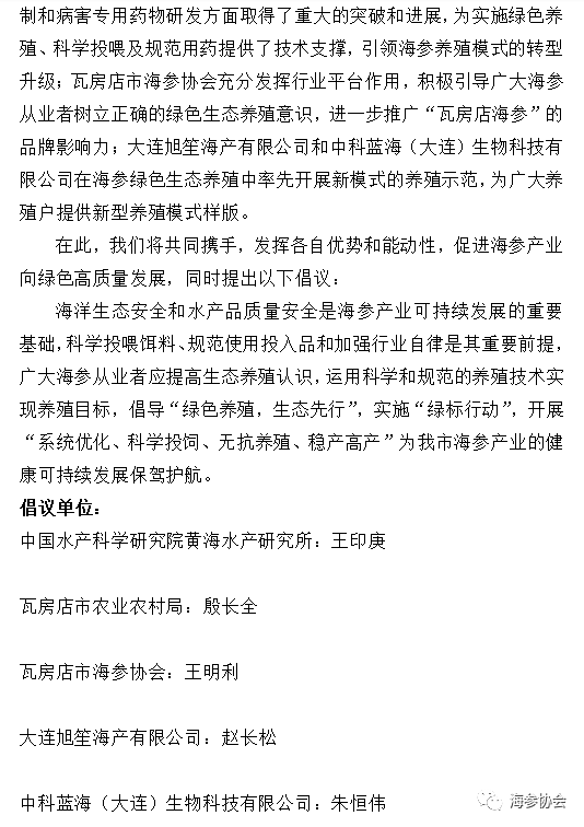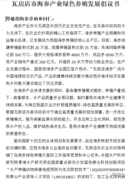 2月28日,由中國水產科學研究所、瓦房店市農業農村局、瓦房店市海參協會、大連旭笙海產有限公司、中科藍海(大連)生物科技有限公司等多家涉海養殖單位,在位于遼刺參主產區的瓦房店市謝屯鎮沙山村的旭笙海產公司共同發起倡議,實施中國水產科學研究院黃海水產研究所重點研發“藍色糧倉”科技創新項目“水產養殖動物病害免疫預防與生態防控技術”(sq2019yfd090034)和泰山產業領導人才項目(LjNY201802)下的工業化飼料研制和病害專用藥物研發,以科學投喂和規范用藥引領傳統海參養殖模式的轉型升級,從海洋生態安全和水產品質量安全的高度,倡導“綠色養殖,生態先行”的養殖新模式,以科學手段和技術支撐,促進遼刺參主產區養殖業轉型升級,提質增效。