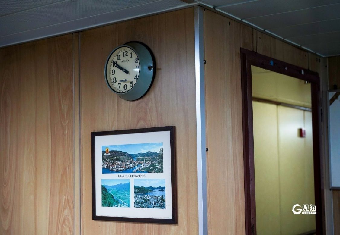 這是“北斗”號(hào)餐廳里的鐘表和照片。