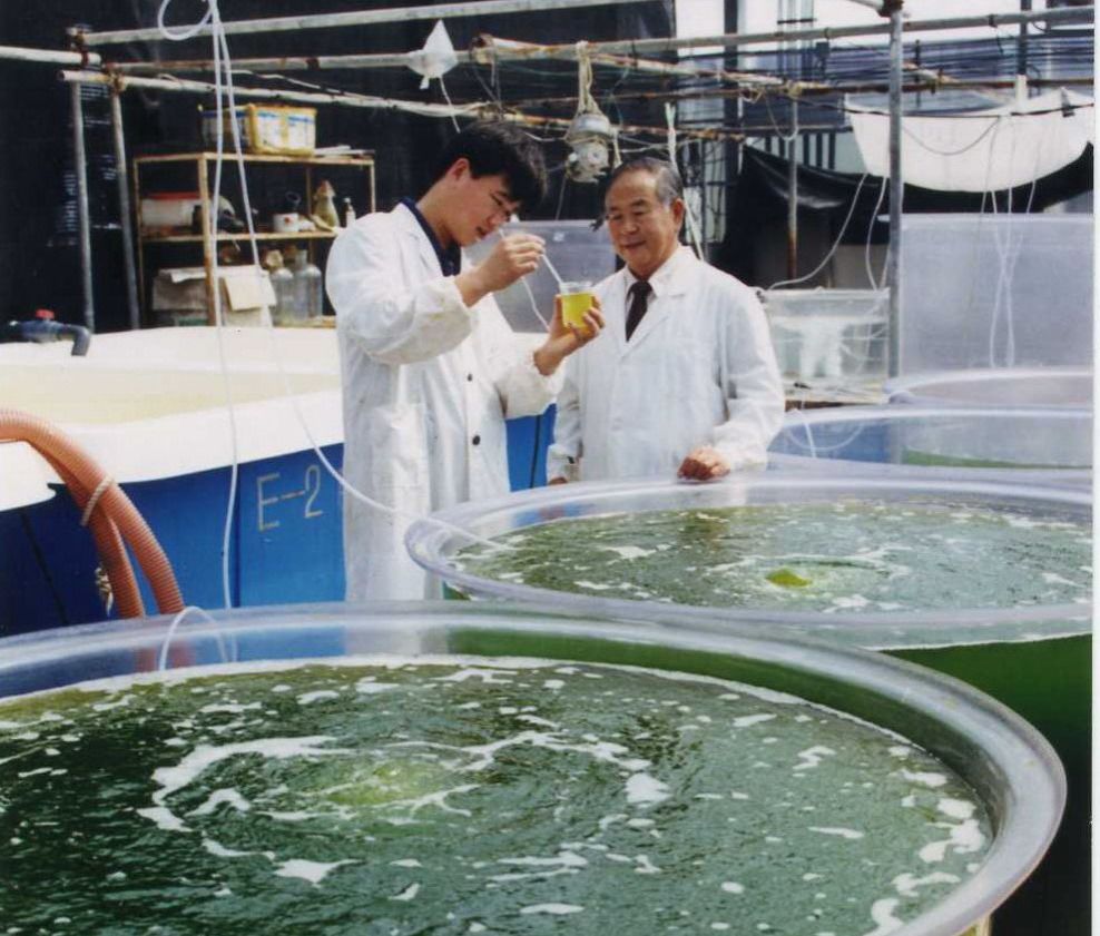90年代,實驗室內觀察對蝦餌料